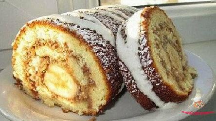 Рулет за 20 минут. И это с учетом времени на выпекание!. Такой рулет за 20 минут очень вкусный. нежный. А кто любит бананы — вообще будет без ума от него!