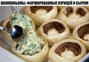 Шампиньоны, фаршированные курицей и сыром, получаются сытными и оригинальными на вкус.. Ингредиенты: 500 г куриного филе 60 г феты 10 больших свежих шампиньонов 4 столовые ложки сметаны 1 столовая ложка муки 1/2 стакана измельченной моцареллы свежая зелень…