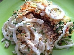 Удивительный салат с кальмарами и орехами «Морские фантазии». Ингредиенты: Кальмары отварные 6-7 шт. Яйца 6 шт. Лук репчатый 2 шт. Морковь 2 шт. Яблоко 2 шт. Грецкие орехи 80-100 гр. Укроп Майонез Приготовление: Лук порезать кубиками и при необходимости…